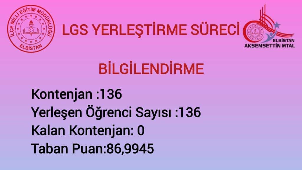 LGS tercih döneminde 136 öğrenci ile kontenjanımız dolmuştur.En son tercih eden öğrencimizin puanı 86,9945 dir.Birinci nakil döneminde okulumuz tercih edecek velilerimizin bu konuda dikkat etmesini bilgilerinize sunarız.